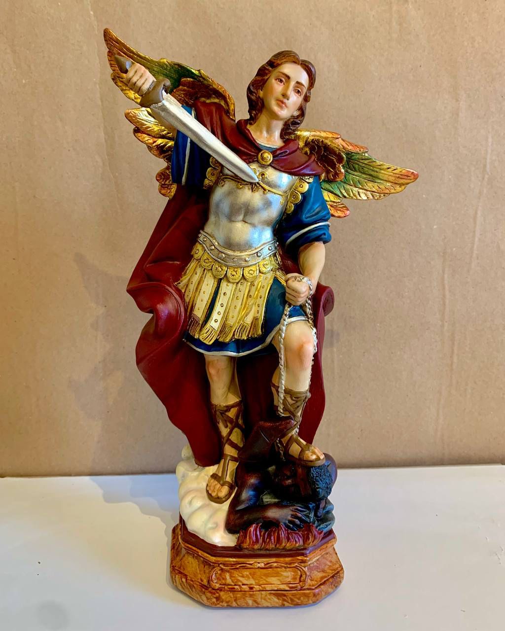 Cada detalhe, das asas abertas em gesto de defesa ao manto esvoaçante, foi elaborado para expressar a nobreza celestial de São Miguel, guerreiro da luz e guardião da justiça divina.